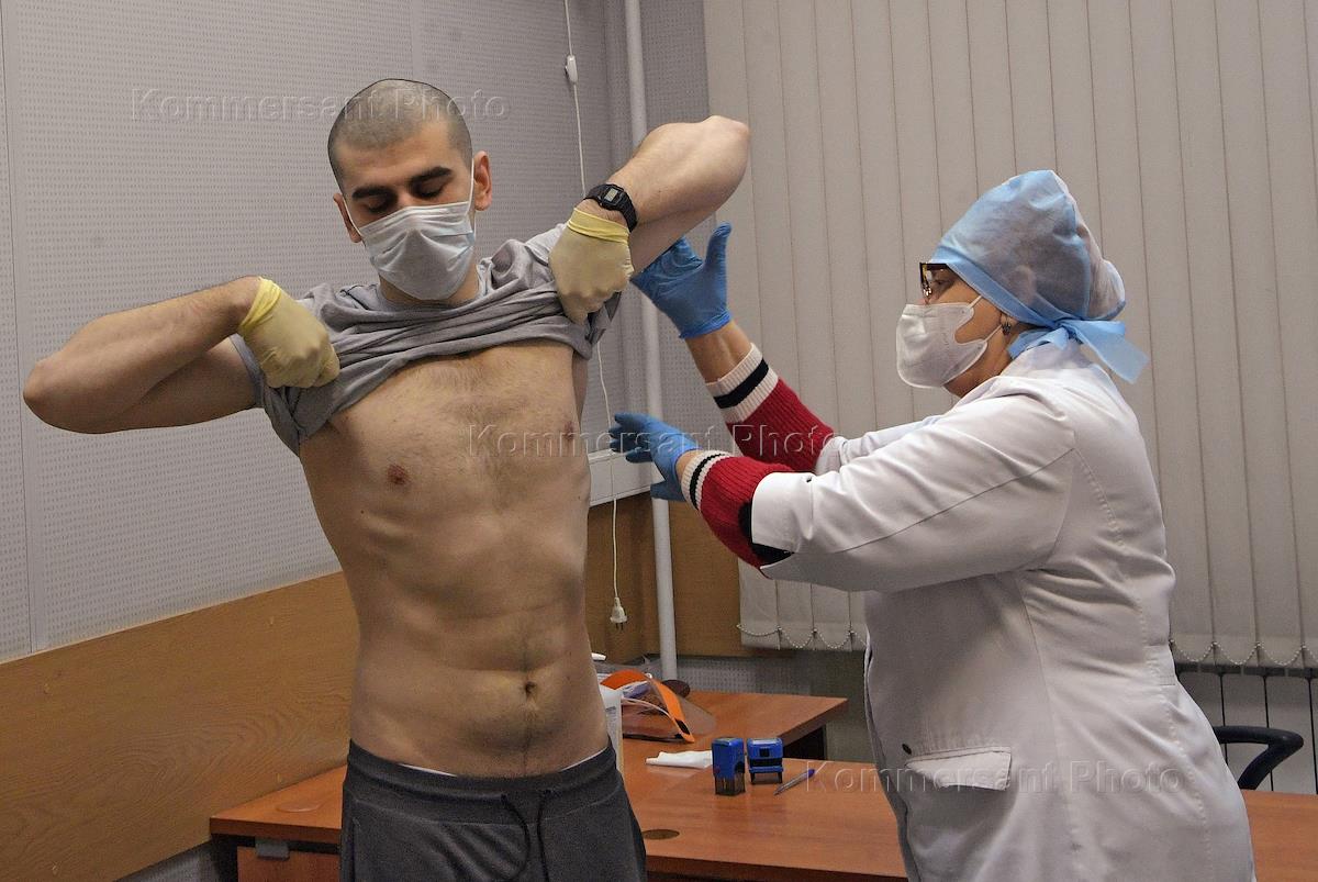 Осенняя призывная кампания 2020 года. Жанровая фотография. Медицинский работник на Сборном призывном пункте военного комиссариата города Москвы во время проведения забора крови для тестирования у призывников перед отправкой их к местам прохождения военной службы.