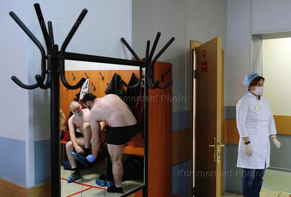 Осенняяя призывная кампания 2020 года. Жанровая фотография. Призывники на Сборном призывном пункте военного комиссариата города Москвы во время прохождения медицинской комиссии перед отправкой к местам прохождения военной службы.
