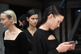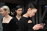 Неделя моды Mercedes-Benz Fashion Week Russia. Показ коллекции марки Otocyon дизанейра Леси Волчок-Русакович на еvent-площадке "Лофт "Надежда"/ Трехгорная Мануфактура". Модели перед началом показа.