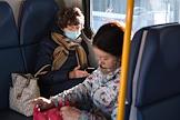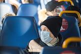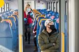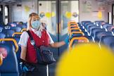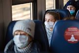 Меры предосторожности и профилактики из-за угрозы распространения коронавирусной инфекции COVID-19. Комплекс противоэпидемических мероприятий в пригородных поездах. Пасажиры в медицинских масках в вагоне поезда.