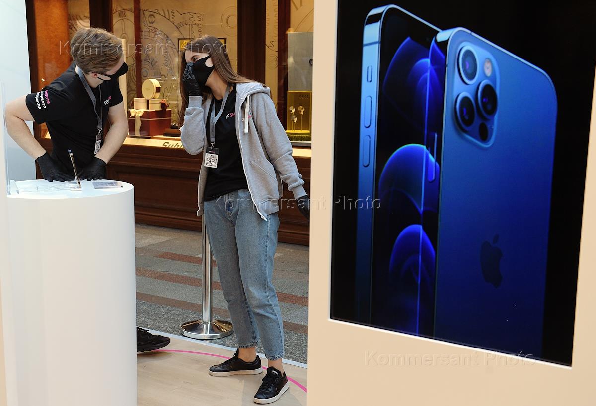 Pop-up магазин "re:Store", открытый к старту продаж в России новых моделей смартфонов iPhone 12 и iPhone12 Pro, в ГУМе. Жанровая фотография. Покупатели в медицинских масках.