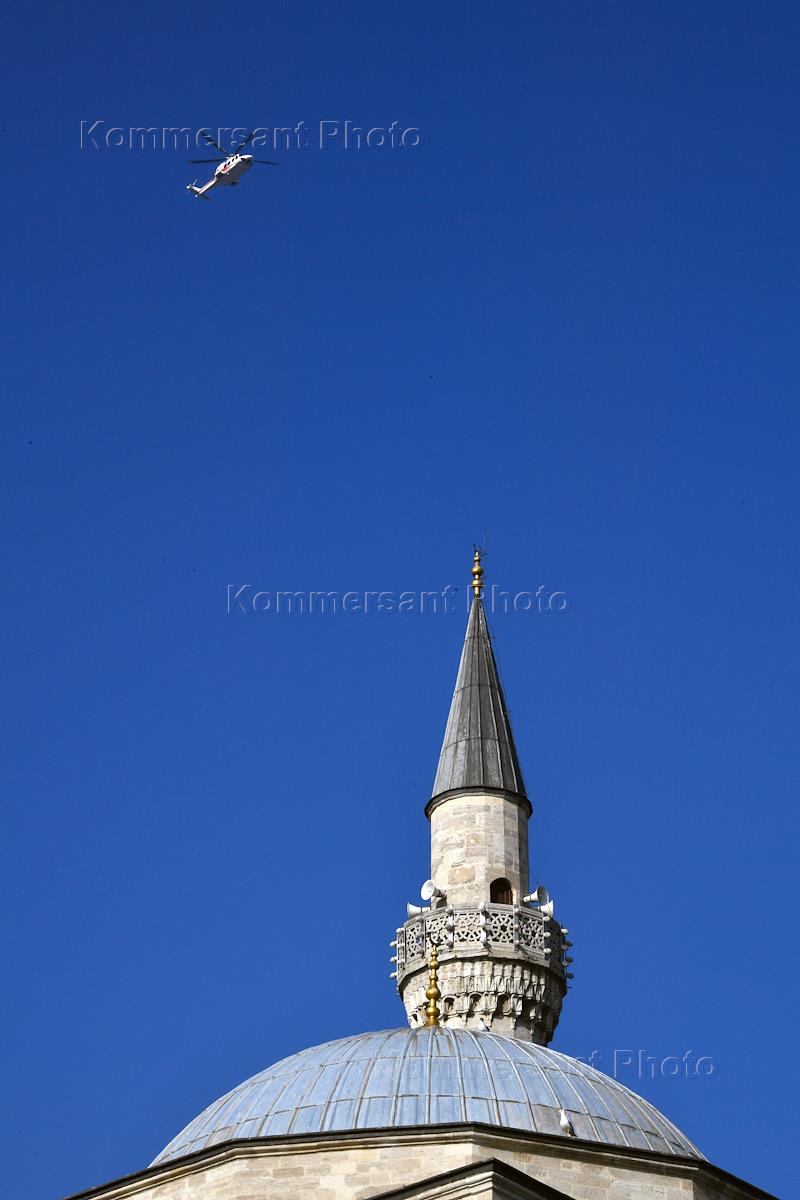 Виды Стамбула. Жанровая фотография. Вертолет и минарет Голубой мечети (мечеть Султанахмет (Sultanahmet Camii)).