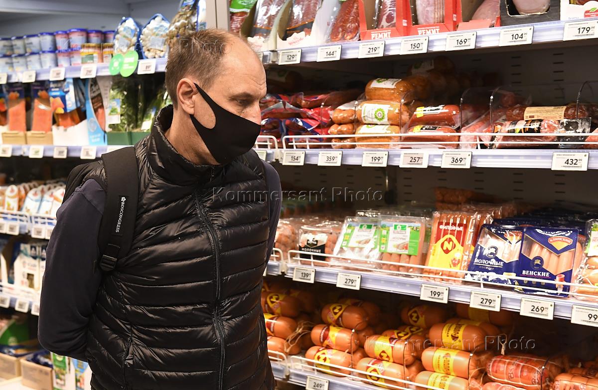 Первый магазин без персонала, с полностью автоматизированной системой покупок "Пятёрочка #налету" открылся на Бульваре Веласкеса. Покупатели в колбасном отделе.