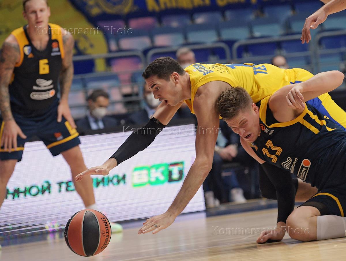 Евролига по баскетболу. Матч между командами БК "Химки" (Химки, Россия) - "Маккаби" (Тель-Авив, Израиль) на стадионе "Арена Мытищи". Игрок команды "Химки" Юнас Йеребко (справа) во время матча.