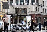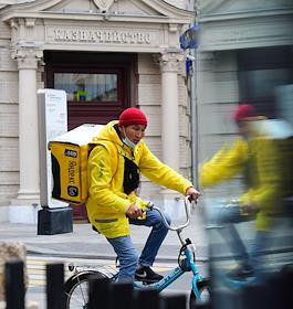 Виды Москвы. Здание Национального исследовательского университета "Высшая школа экономики" на улице Мясницкая. Жанровая фотография. Курьер службы доставки "Яндекс. Еда" на велосипеде.