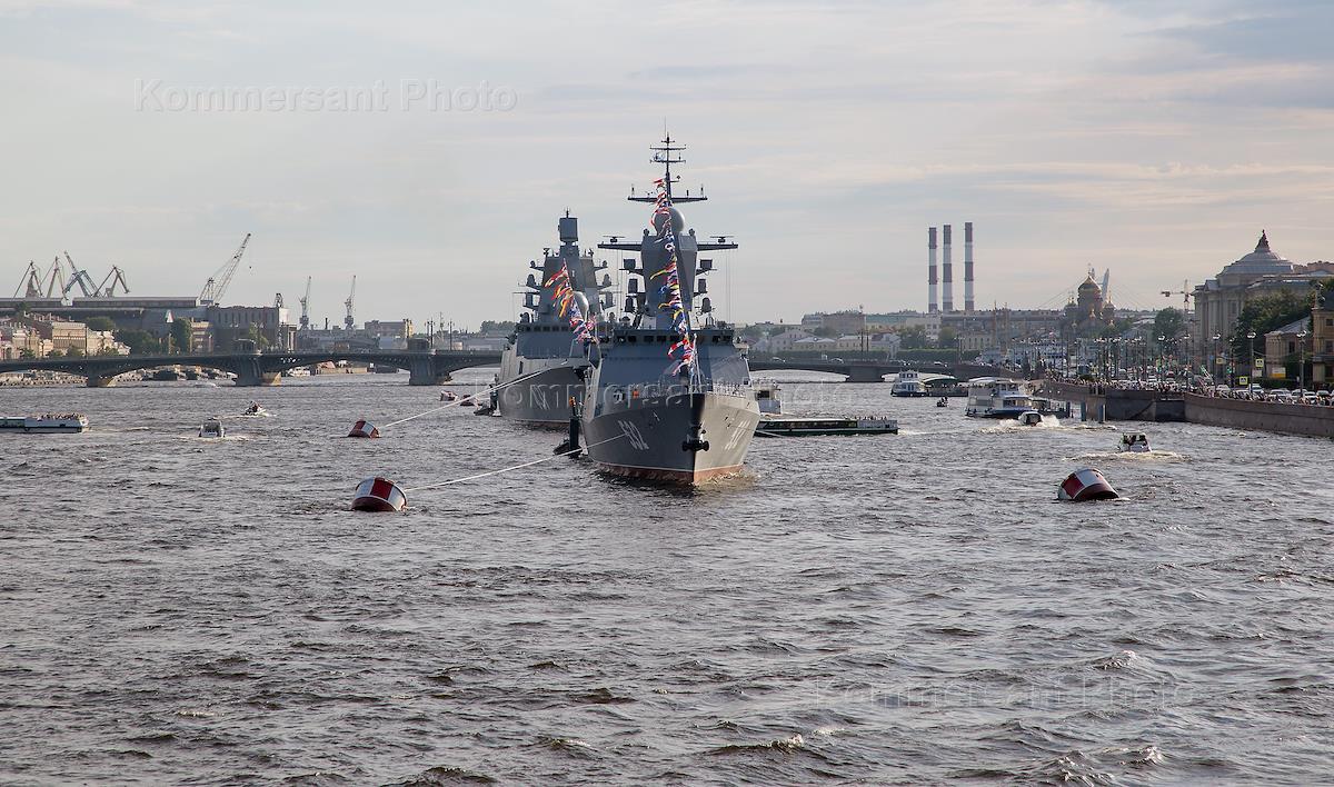 Подготовка к главному военно-морскому параду в честь Дня Военно-морского Флота (ВМФ) России. Корвет "Бойкий" и фрегат "Адмирал Касатонов" на стоянке в акватории реки Невы.