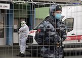 Работа временного госпиталя для коронавирусных больных в павильоне №5 "Ленэкспо". Очередь из машин скорой помощи у приемного отделения госпиталя.