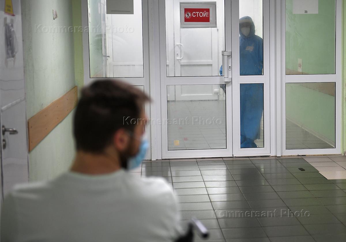 Городская клиническая больница (ГКБ) №15 имени О.М.Филатова. Жанровая фотография. Работа сотрудников больницы в "красной зоне", где лежат пациенты инфицированные коронавирусом. Пациенты в приемном отделении больницы.