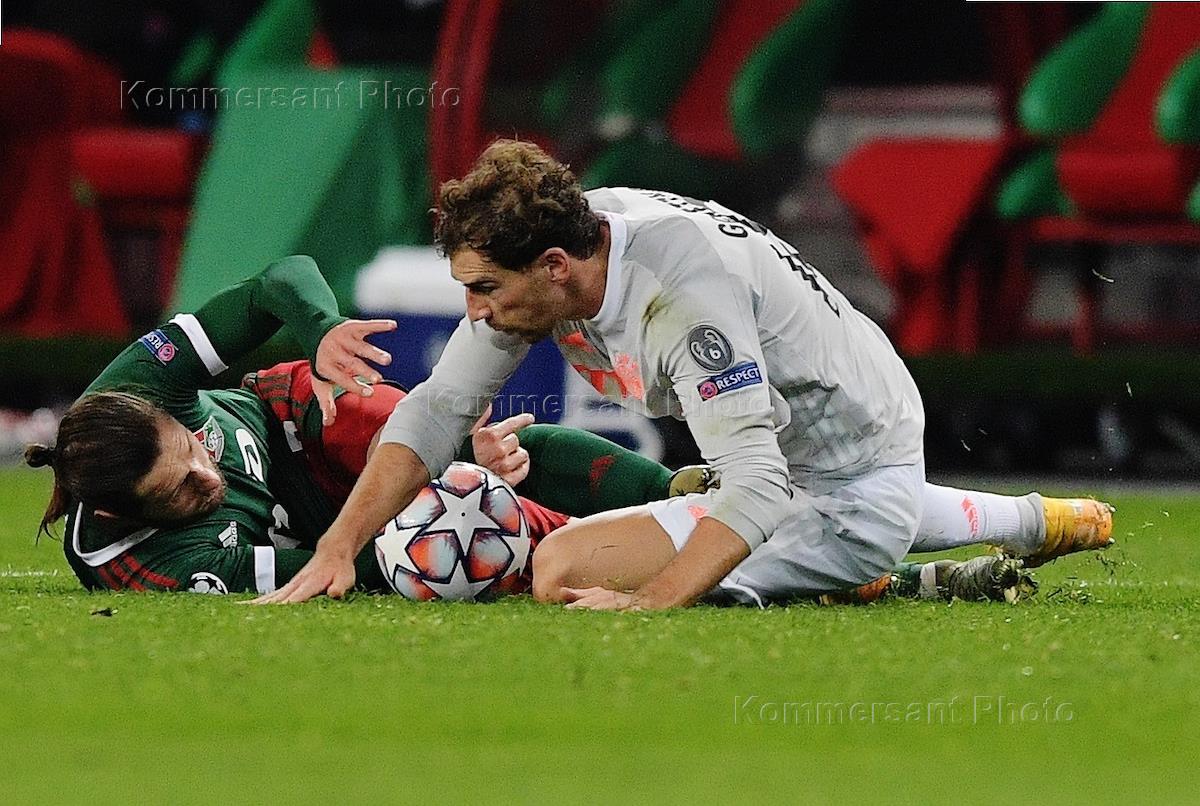 Лига чемпионов УЕФА по футболу. 2 Тур. Матч между командами "Локомотив" (Россия, Москва) - "Бавария" (Германия, Мюнхен) на стадионе "РЖД Арена". игрок команды "Бавария" Серж Гнабри (в центре) и игрок команды "Локомотив" Дмитрий Живоглядов (слева) во время матча.