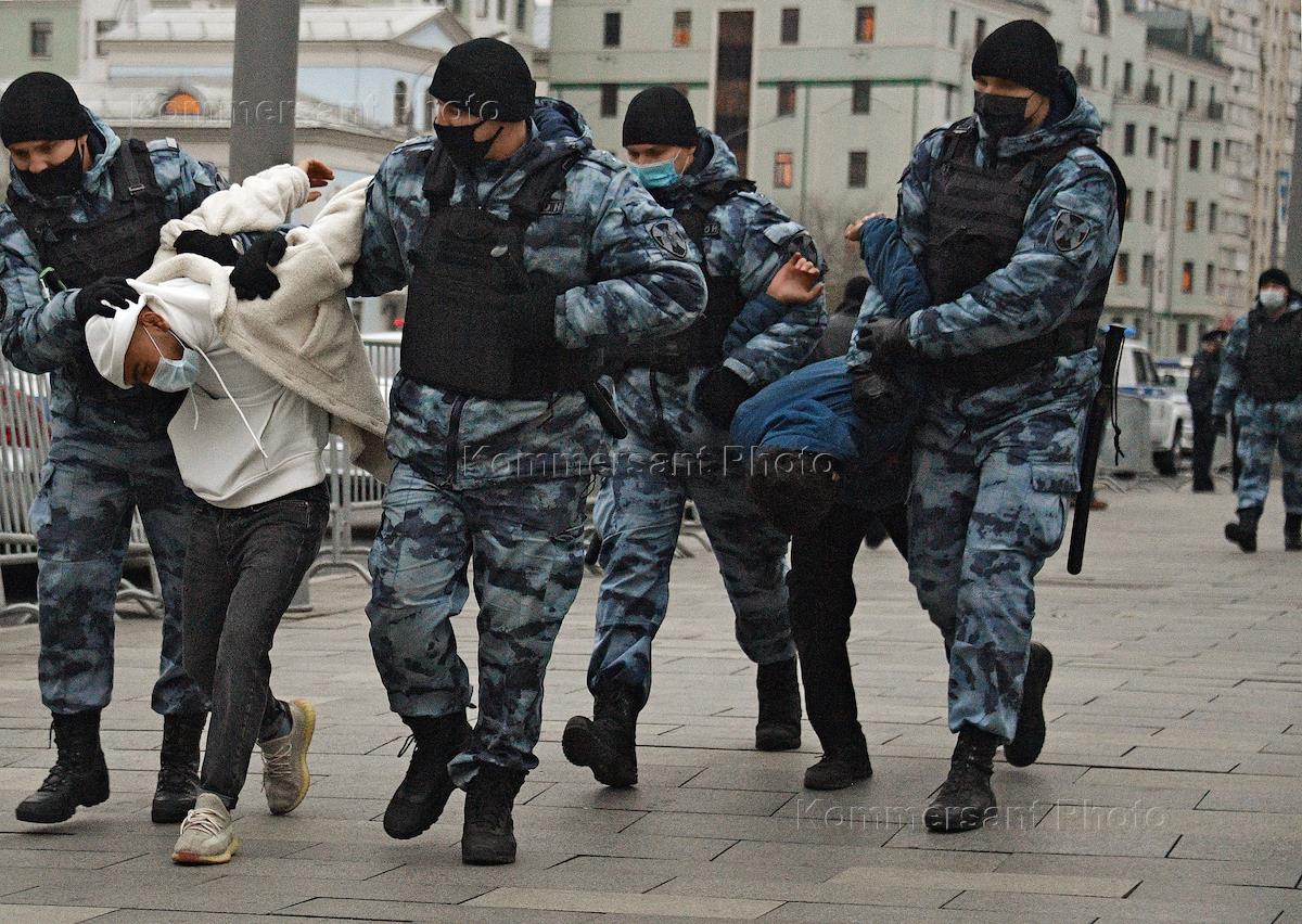 Акция протеста против новых публикаций карикатур на пророка Мухаммеда сатирическим журналом Charlie Hebdo у посольства Франции в Москве. Сотрудники полиции во время задержания участников акции.