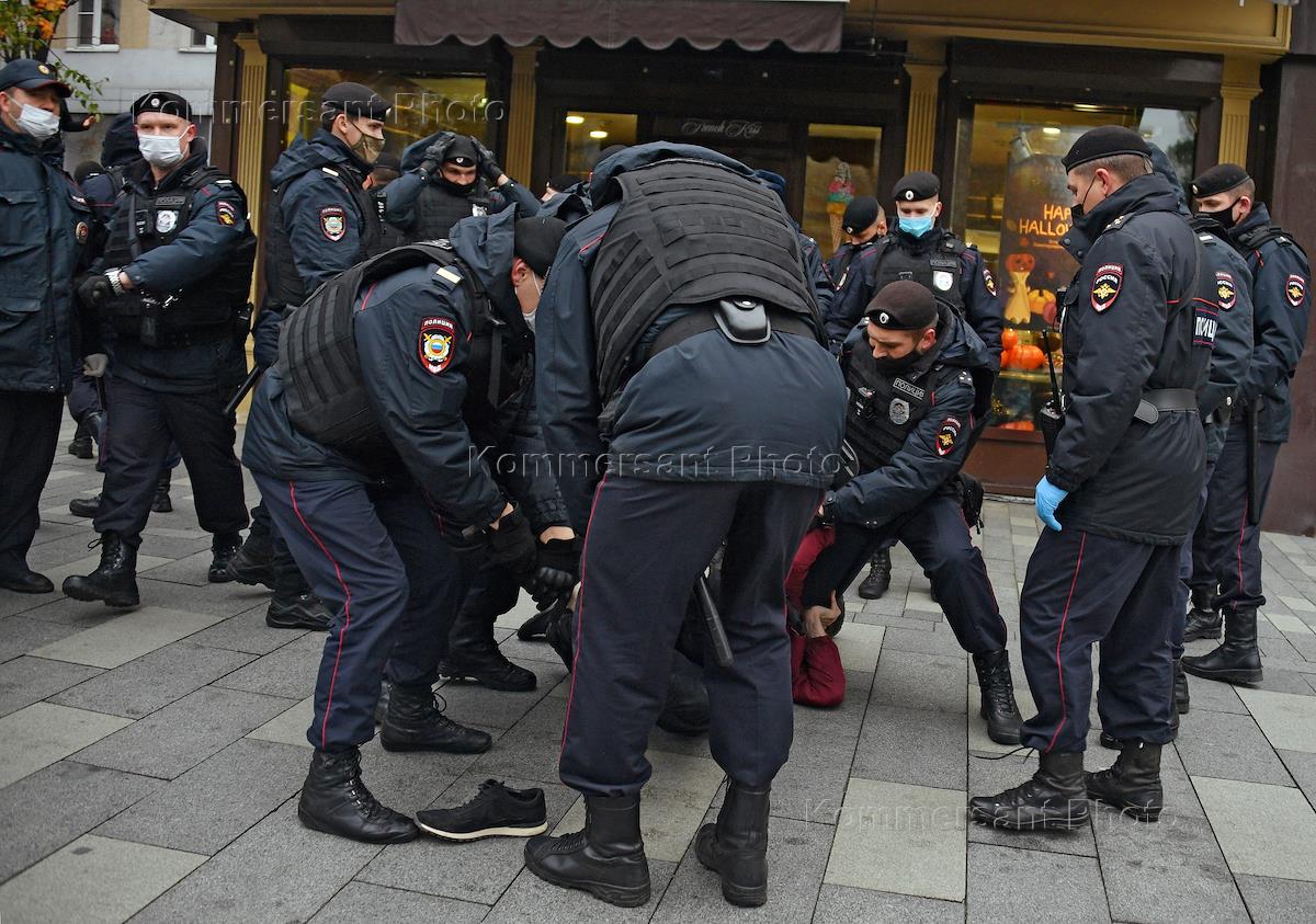 Акция протеста против новых публикаций карикатур на пророка Мухаммеда сатирическим журналом Charlie Hebdo у посольства Франции в Москве. Сотрудники полиции во время задержания участников акции.