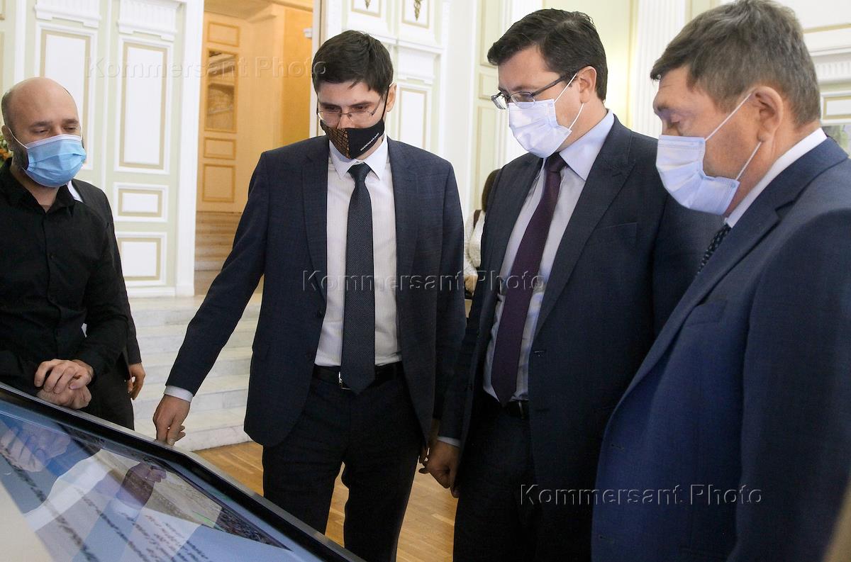 Собрание, посвященное дню работников сельского хозяйства и перерабатывающей промышленности, состоялось в Гербовом зале Нижегородской ярмарки. Заместитель губернатора Нижегородской области, Андрей Саносян (второй слева), губернатор Нижегородской области Глеб Никитин (второй справа) и министр сельского хозяйства и продовольственных ресурсов Нижегородской области Николай Денисов (справа) во время осмотра выставки продукции аграрно-промышленного комплекса (АПК) Нижегородской области.