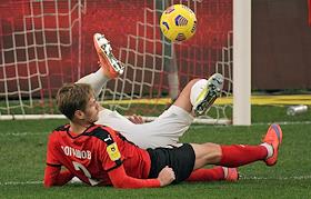 Российская Премьер-Лига (РПЛ). Тинькофф - Чемпионат России по футболу 2020/2021. 13-й тур. Матч между командами "Химки"(Химки) и "Зенит" (Санкт-Петербург) на стадионе "Арена Химки". Игрок команды "Химки" Денис Глушаков (справа) во время матча.