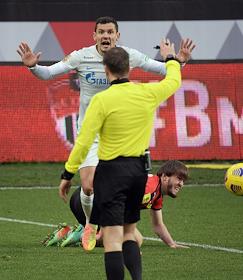 Российская Премьер-Лига (РПЛ). Тинькофф - Чемпионат России по футболу 2020/2021. 13-й тур. Матч между командами "Химки"(Химки) и "Зенит" (Санкт-Петербург) на стадионе "Арена Химки". Слева направо: игрок команды "Зенит" Юрий Жирков, игрок команды "Химки" Дмитрий Тихий и вратарь команды "Зенит" Михаил Кержаков во время матча.