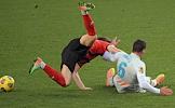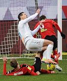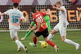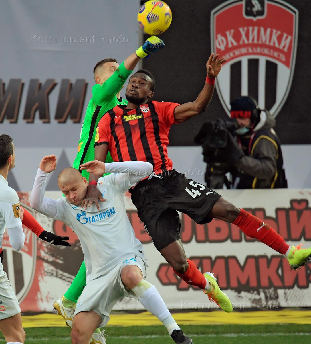 Российская Премьер-Лига (РПЛ). Тинькофф - Чемпионат России по футболу 2020/2021. 13-й тур. Матч между командами "Химки"(Химки) и "Зенит" (Санкт-Петербург) на стадионе "Арена Химки". Справа налево: игрок команды "Химки" Мохамед Конате, вратарь команды "Зенит" Михаил Кержаков и игрок команды "Зенит" Ярослав Ракицкий во время матча.