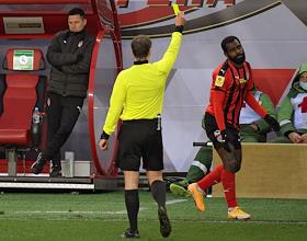 Российская Премьер-Лига (РПЛ). Тинькофф - Чемпионат России по футболу 2020/2021. 13-й тур. Матч между командами "Химки"(Химки) и "Зенит" (Санкт-Петербург) на стадионе "Арена Химки". Главный судья Алексей Матюнин (слева, спиной) и игрок команды "Химки" Брайан Идову (справа) во время матча.