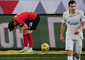 Российская Премьер-Лига (РПЛ). Тинькофф - Чемпионат России по футболу 2020/2021. 13-й тур. Матч между командами "Химки"(Химки) и "Зенит" (Санкт-Петербург) на стадионе "Арена Химки". Игрок команды "Химки" Резиуан Мирзов (слева) во время матча.