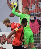 Российская Премьер-Лига (РПЛ). Тинькофф - Чемпионат России по футболу 2020/2021. 13-й тур. Матч между командами "Химки"(Химки) и "Зенит" (Санкт-Петербург) на стадионе "Арена Химки". Справа налево: игрок команды "Химки" Мохамед Конате, вратарь команды "Зенит" Михаил Кержаков и игрок команды "Зенит" Ярослав Ракицкий во время матча.