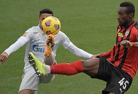 Российская Премьер-Лига (РПЛ). Тинькофф - Чемпионат России по футболу 2020/2021. 13-й тур. Матч между командами "Химки"(Химки) и "Зенит" (Санкт-Петербург) на стадионе "Арена Химки". Игрок команды "Химки" Резиуан Мирзов (слева) во время матча.