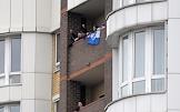 Российская Премьер-Лига (РПЛ). Тинькофф - Чемпионат России по футболу 2020/2021. 13-й тур. Матч между командами "Химки"(Химки) и "Зенит" (Санкт-Петербург) на стадионе "Арена Химки". Жанровая фотография. Болельщики команды "Зенит" на балконе жилого дома.