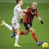 Российская Премьер-Лига (РПЛ). Тинькофф - Чемпионат России по футболу 2020/2021. 13-й тур. Матч между командами "Химки"(Химки) и "Зенит" (Санкт-Петербург) на стадионе "Арена Химки". Игрок команды "Химки" Мохамед Конате (слева) и игрок команды "Зенит" Ярослав Ракицкий (справа) во время матча.
