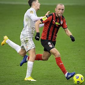 Российская Премьер-Лига (РПЛ). Тинькофф - Чемпионат России по футболу 2020/2021. 13-й тур. Матч между командами "Химки"(Химки) и "Зенит" (Санкт-Петербург) на стадионе "Арена Химки". Игрок команды "Химки" Денис Глушаков (справа) во время матча.
