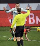 Российская Премьер-Лига (РПЛ). Тинькофф - Чемпионат России по футболу 2020/2021. 13-й тур. Матч между командами "Химки"(Химки) и "Зенит" (Санкт-Петербург) на стадионе "Арена Химки". Главный судья Алексей Матюнин (слева, спиной) и игрок команды "Химки" Брайан Идову (справа) во время матча.