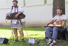 Виды Сергиева Посада. Жанровая фотография. Музыканты-гусляры играют на гуслях у стен Свято-Троицкой Сергиевой Лавры.
