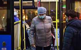 Виды Москвы. Жанровая фотография. Городская жизнь в условиях распространения коронавируса COVID-19. Пассажиры в медицинских масках в салоне автобуса.