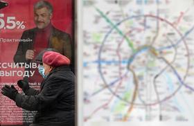Виды Москвы. Жанровая фотография. Городская жизнь в условиях распространения коронавируса COVID-19. Женщина в медицинской маске на фоне светового информационного табло пункт обмена валют.