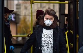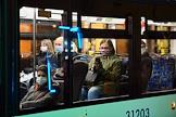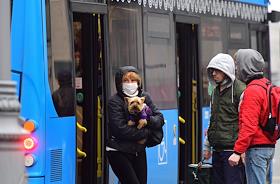 Виды Москвы. Жанровая фотография. Городская жизнь в условиях распространения коронавируса COVID-19. Пассажиры в медицинских масках в салоне автобуса.