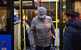 Виды Москвы. Жанровая фотография. Городская жизнь в условиях распространения коронавируса COVID-19. Пассажиры в медицинских масках на остановке общественного транспорта.