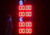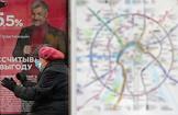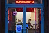 Виды Москвы. Жанровая фотография. Городская жизнь в условиях распространения коронавируса COVID-19. Женщина в медицинской маске на фоне светового информационного табло пункт обмена валют.