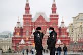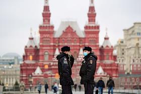 Виды Москвы. Жанровая фотография. Городская жизнь в условиях распространения коронавируса COVID-19. Сотрудники полиции в медицинских масках на Красной площади.