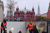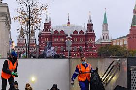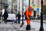 Виды Москвы. Тверская улица. Жанровая фотография. Городская жизнь в условиях распространения коронавируса COVID-19. Сотрудники муниципальных служб в медицинских масках во время уборки мусора.