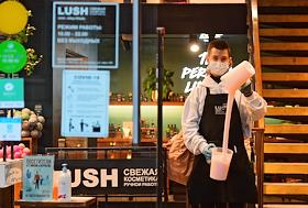 Виды Москвы. Жанровая фотография. Городская жизнь в условиях распространения коронавируса COVID-19. Сотрудник косметического магазина LUSH в медицинской маске и перчатках.