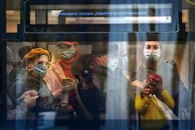 Виды Москвы. Жанровая фотография. Городская жизнь в условиях распространения коронавируса COVID-19. Пассажиры в медицинских масках на выходе со станции метро.