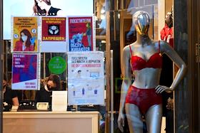Виды Москвы. Жанровая фотография. Бизнес и городская жизнь в условиях распространения коронавируса COVID-19. Объявления о правилах масочного режима в витрине магазина нижнего белья.