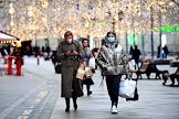 Виды Москвы. Улица Тверская. Городская жизнь в условиях распространения коронавируса COVID-19. Прохожие в медицинских масках на улицах города.
