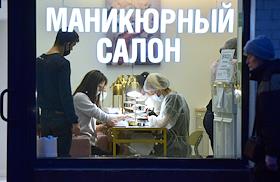 Виды Москвы. Жанровая фотография. Бизнес и городская жизнь в условиях распространения коронавируса COVID-19. Сотрудники и клиенты маикюрного салона в медицинских масках.
