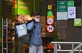 Виды Москвы. Жанровая фотография. Бизнес и городская жизнь в условиях распространения коронавируса COVID-19. Курьер службы доставки магазина продуктов для здорового питания "ВкусВилл" в медицинской маске на выходе из магазина.