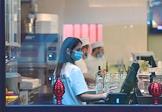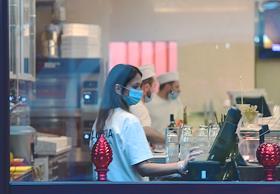 Виды Москвы. Жанровая фотография. Бизнес и городская жизнь в условиях распространения коронавируса COVID-19. Сотрудники кафе в медицинских масках.