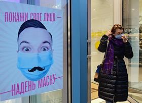 Виды Москвы. Жанровая фотография. Бизнес и городская жизнь в условиях распространения коронавируса COVID-19. Плакат "Покажи свое лицо - надень маску" в витрине магазина.