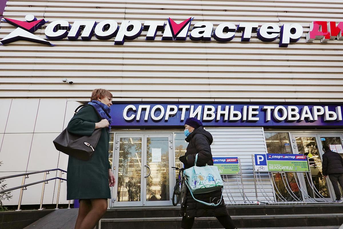 Moscow scenery. Genre photography. Urban life amid the spread of the COVID-19. Passers-by in medical masks on the streets. Shop "Sport Master Discount".