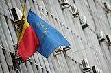 Выборы президента Молдавии. Жанровая фотография. Государственный флаг Молдавии и флаг Европы на стене здания.