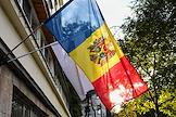 Выборы президента Молдавии. Жанровая фотография. Флаги с государственным гербом Молдавии на стене здания.
