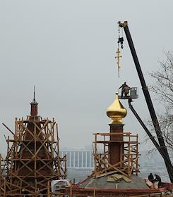 Виды Нижнего Новгорода. Ремонтные работы на объектах культурного наследия. Установка креста на купол церкви Симеона Столпника (Симеоновский храм) на территории Нижегородского кремля.