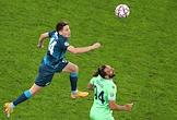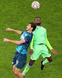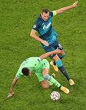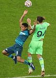 Лига чемпионов УЕФА по футболу. 3 тур. Матч между командами "Зенит" (Россия, Санкт-Петербург) и "Лацио" (Рим, Италия) на стадионе "Газпром Арена". Игрок команды "Зенит" Артем Дзюба (слева) и игрок команды "Лацио" Сергей Милинкович-Савич (слева) во время матча.