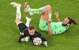 Лига чемпионов УЕФА по футболу. 3 тур. Матч между командами "Зенит" (Россия, Санкт-Петербург) и "Лацио" (Рим, Италия) на стадионе "Газпром Арена". Слева направо: вратарь команды "Лацио" Пепе Рейна, игроки команды "Зенит" Александр Ерохин и Артем Дзюба во время матча.
