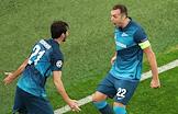 Лига чемпионов УЕФА по футболу. 3 тур. Матч между командами "Зенит" (Россия, Санкт-Петербург) и "Лацио" (Рим, Италия) на стадионе "Газпром Арена". Игроки команды "Зенит" Артем Дзюба (справа) и Александр Ерохин (слева) во время матча.